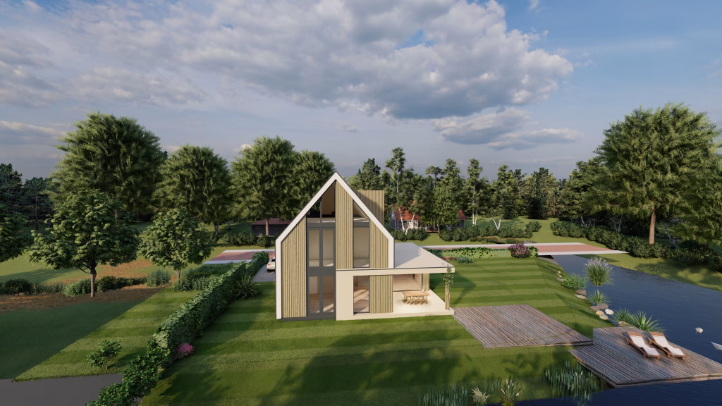 Villa Fontaine is een klassieke villa met een duidelijke kapvorm, een krachtige gevelindeling en hoge glaspartijen in de kopgevel. De combinatie van verticale houten gevelbekleding, metselwerkaccenten en een traditionele daklijn zorgt voor een evenwichtig en tijdloos geheel. Binnen het eVilla-concept wordt dit ontwerp volledig technisch voorbereid en prefab gerealiseerd, waardoor u vooraf inzicht krijgt in investering, planning en bouwkwaliteit en de bouwtijd op locatie aanzienlijk wordt verkort.