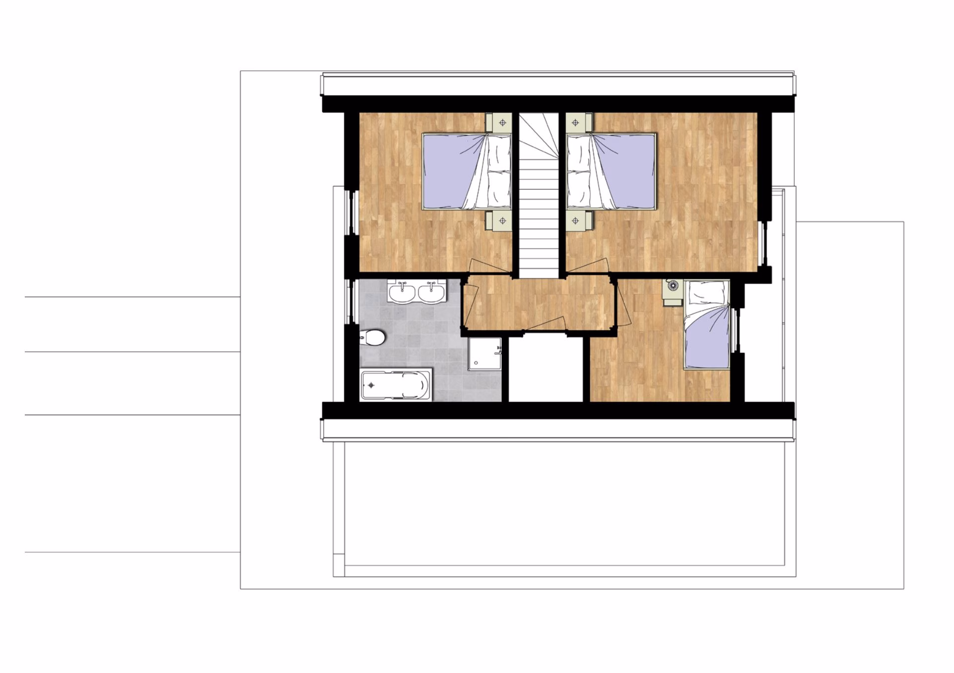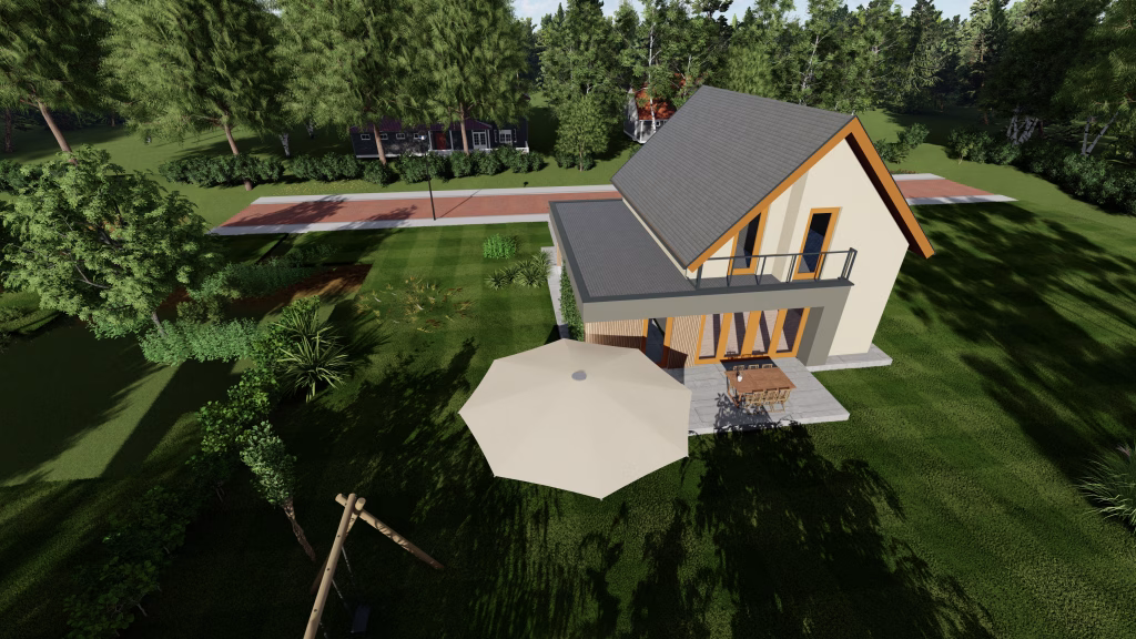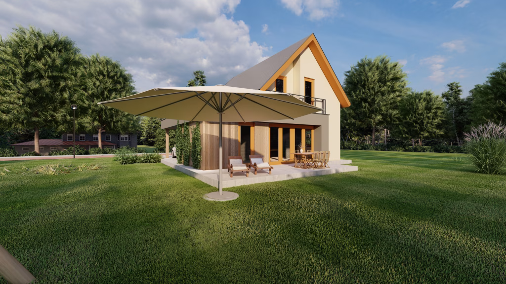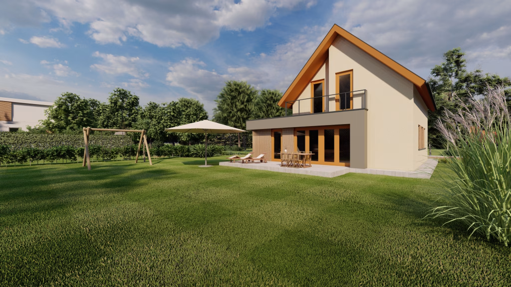 Met een maatvoering van 9 bij 11 meter biedt Villa Soleil een efficiënte en functionele indeling over twee lagen. De woning beschikt over 3 slaapkamers en 1 badkamer. De begane grond is gericht op een open leefruimte met directe verbinding naar de tuin, terwijl de verdieping ruimte biedt aan de slaapkamers onder de kap.